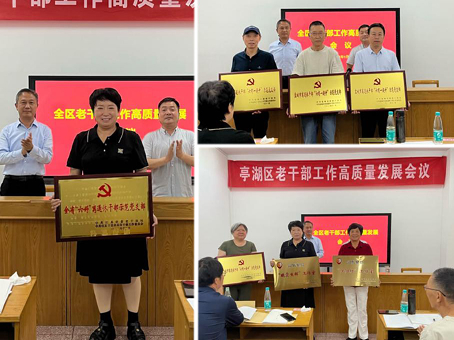 会议为荣获全省首批“六好”离退休干部示范党支部的新兴镇离退休干部党支部,荣获市级第三批离退休干部“六有一提升”示范党支部的先锋街道老干部党支部、文峰街道老干部党支部、区教育局机关离退休人员党支部,荣获市级第一批“银辉耀盐”志愿者工作室的亭湖公安分局鹤翔课堂工作室、新兴镇“晚霞生辉”工作室、便仓镇“夕阳红”工作室颁奖。