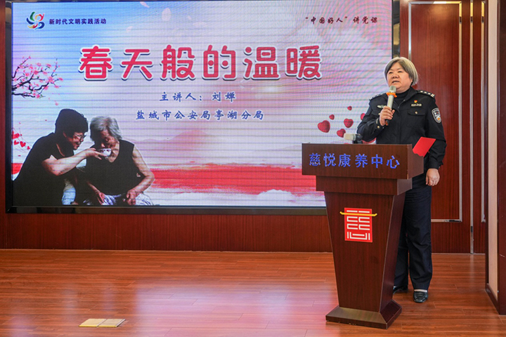 “调解高手炼就‘绕指柔’、勇挑重担牵手‘穷亲戚’、尊老爱老情注‘夕阳红’、以爱滋养缘续‘一家人’”,“中国好人”、江苏省巾帼党课讲师、盐城市公安局亭湖分局四级高级警长刘婵以充沛的感情、动情的表述宣讲陆春銮先进事迹,退休党员无私奉献社会的高大形象走进人们的心田。